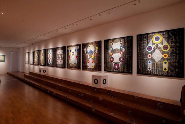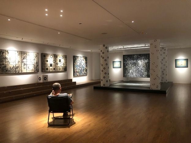 9. Trong không gian trưng bày của triển lãm “trăm năm tính cuộc vuông tròn”, các vòng tròn không chỉ nằm trên tranh. Chúng còn xuất hiện như một mô-típ tràn lan ra cột, tường, sàn cũng như trong luồng ánh sáng chiếu hắt trên trần. Khi mô-típ ấy được lặp lại đậm đặc như vậy, người xem dường không còn đứng trước “những bức tranh”.... bước vào không gian của triển lãm như đang bước vào một không gian đậm chất nghi lễ: nghi lễ của sự lặp lại, của việc liên tục “nhắc nhở” về thế giới bằng các vòng tròn.