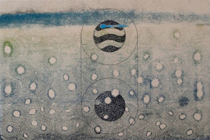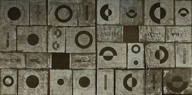 6. Điểm nổi bật nhất trong loạt tác phẩm có mặt trong triển lãm “Trăm năm tính cuộc vuông tròn” là một hệ ký hiệu cố tình được đặt ở ngưỡng “sắp đọc được nhưng không đọc được”. Ta thấy các dấu cộng/trừ, các vạch ngang/dọc, những mô-típ tròn đặc - tròn rỗng - tròn chia đôi, những chấm nhỏ xếp hàng như chuỗi mã. Có lúc, nó gợi nhớ tới bảng điều khiển của một cỗ máy, gợi tới dãy công thức toán học, gợi nhớ tới một thứ ngôn ngữ kỹ thuật; có lúc nó lại giống ký hiệu bùa chú, giống những cái “ấn” của một nghi lễ tôn giáo hay của các thầy phù thủy. Chính vùng mơ hồ này khiến tác phẩm vận hành như một ngôn ngữ không-đặt-tên: người xem không thể giải mã theo kiểu “dịch nghĩa” (vì không có từ vựng cố định), nhưng lại cũng không thể chỉ xem như vật trang trí tùy tiện (vì chúng dường như có một cấu trúc quá nghiêm ngặt và tuân thủ một quy luật nào đó).
