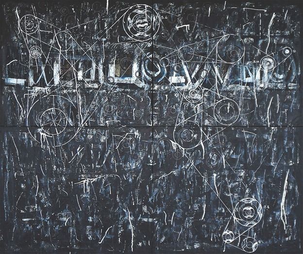 8. Mỗi bức tranh trong cuộc triển lãm này có thể xem là một “văn bản” được tạo ra từ những “chữ viết của hành động”. Nét cào, nét kéo, vệt loang, những lớp phủ xám đen… làm lộ một thứ thời gian vật chất: thời gian của cọ, của chà xát, của bồi đắp rồi xóa. Ký hiệu vì vậy không phải là hình minh họa; nó là dấu chỉ của lao động. Cảm giác về những cái “bảng” này – như bảng lớp học, bảng công thức, bảng ghi – xuất hiện không chỉ vì có đường kẻ, mà vì đã có một lịch sử của việc ghi - xóa - ghi lại. Nếu chỉ có thuần túy các ký hiệu, tranh có nguy cơ trở thành một sản phẩm “đồ họa đẹp”. Nhưng Doãn Hoàng Kiên cố tình không để bề mặt tranh của mình ở dạng “bóng bẩy” hay “mới mẻ”. Tranh của anh thường cũ, sần, ta cảm tưởng dường như chúng bị thời gian bào đi. Nét cào, vệt quét, lớp chồng lớp, chỗ dày chỗ mỏng, chỗ như vừa bị xóa. Vì thế, người ta có cảm giác mỗi bức tranh là một tấm bảng của những ký ức đã từng được viết lên, đã từng sửa, đã từng bị phủ đi rồi lại viết lại.