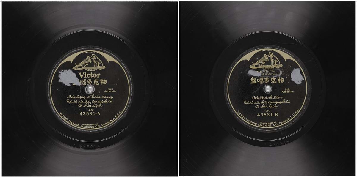 Mặt A bài Vọng cổ hoài lang và mặt B bài Hành vân trên dĩa nhựa 78 được sản xuất bởi công ty Victor Talking Machine từ thập niên 1920. Ảnh: Nguyễn Lê Tuyên
