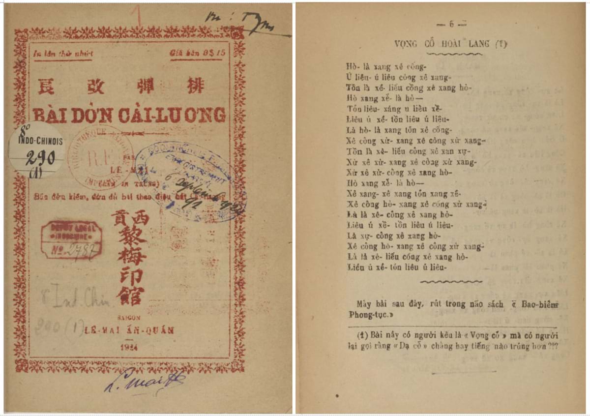 Một tài liệu vừa mới được phát hiện là một văn bản trong tập sách Bản đờn cải lương của tác giả Lê-Mai về bài Vọng cổ hoài lang được Nhà xuất bản Lê-Mai Ấn-Quán in năm 1924.