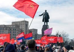 Năm 2014, một số tỉnh miền Đông tuyên bố ly khai với sự hậu thuẫn của Nga. Người ủng hộ Nga biểu tình với cờ Liên Xô trước tượng Lenin ở Kharkiv (2014)