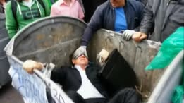 Chính trị gia Vitaly Zhuravsky bị đám đông giận giữ ném vào thùng rác hồi năm 2014